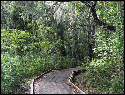 Raised boardwalks and pathways are necessary to get through this dense swamp vegetation. Non-stop vistas of hardwood forests, palmettos and swamp with baldcypress trees.